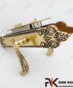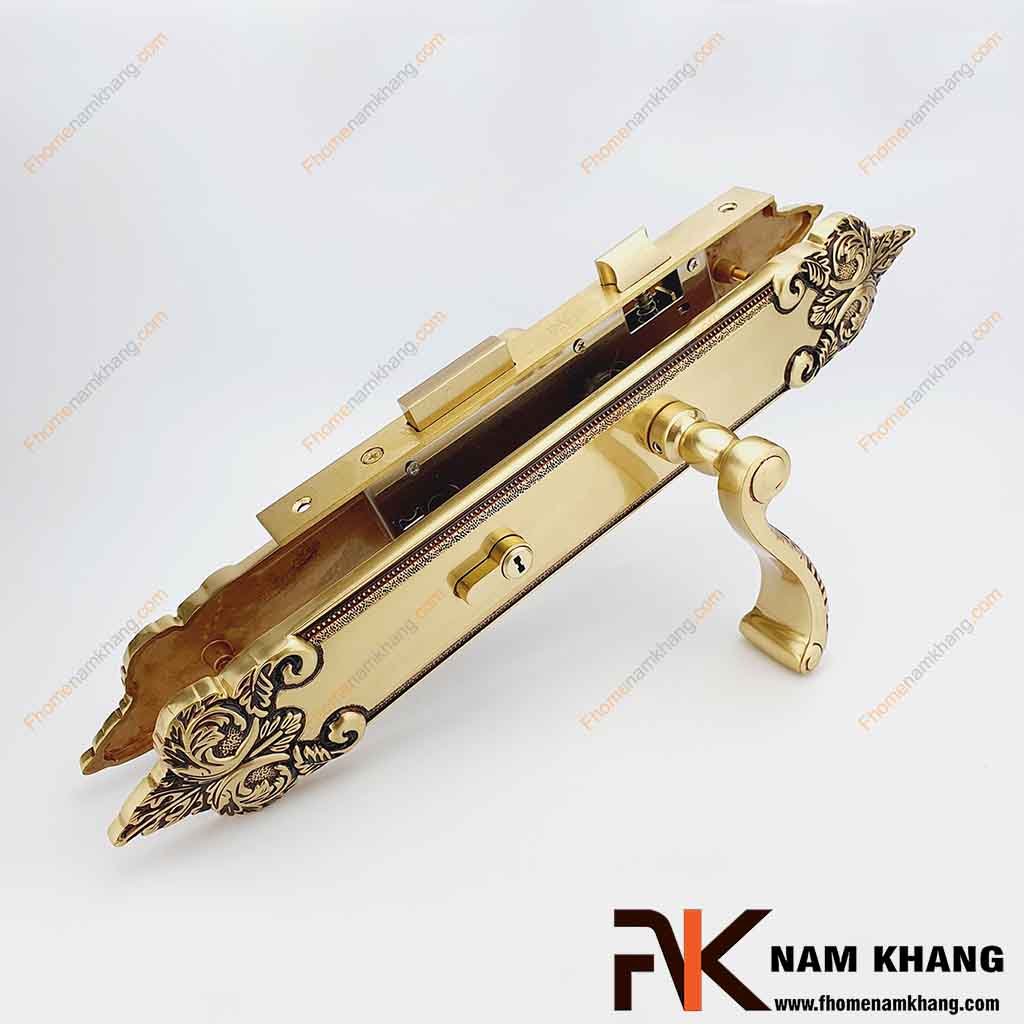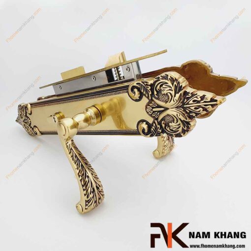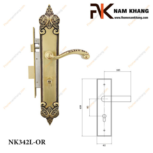 Khóa cửa chính NK342L-OR Sản phẩm khóa cửa chính được sử dụng chủ yếu cho cửa gỗ lớn, cao cấp, 2 hoặc 4 cánh. Tay ốp khóa được sản xuất từ vật liệu đồng vàng mạ màu đồng viền đen. Thân khóa, then khóa được làm từ đồng vàng cao cấp, bền bỉ, có kết cấu chắc chắn và an toàn. Trên toàn bộ phần ốp khóa và tay gạt được sử dụng các họa tiết trang trí cổ điển càng làm tăng giá trị thẩm mĩ và khả năng phối hợp của khóa cửa.