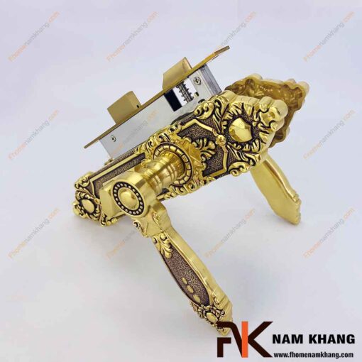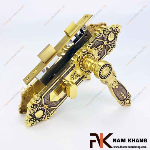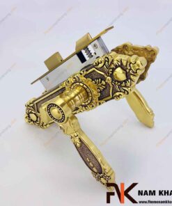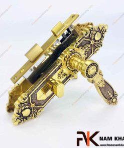 Sản phẩm được sản xuất từ vật liệu đồng cao cấp mang lại độ bền cao và kết cấu bền chắc. Phần ốp và tay gạt của khóa cửa có các họa tiết hoa lá cổ điển phân vùng nâu đỏ rất đẳng cấp và sang trọng.