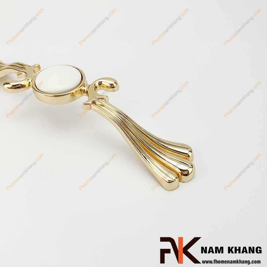Tay nắm tủ sứ trắng vàng NK020L-TV kệ, ngăn kéo, tủ trưng bày được thiết kế với kim loại bền đẹp được mạ vàng sáng bóng làm toát lên vẻ ngoài của sản phẩm. Bên cạnh đó tay nắm được tạo điểm nhấn từ viên sứ cao cấp được gia công tí mỉ bo cạnh gọn gàng làm nâng cao giá trị thẫm mĩ